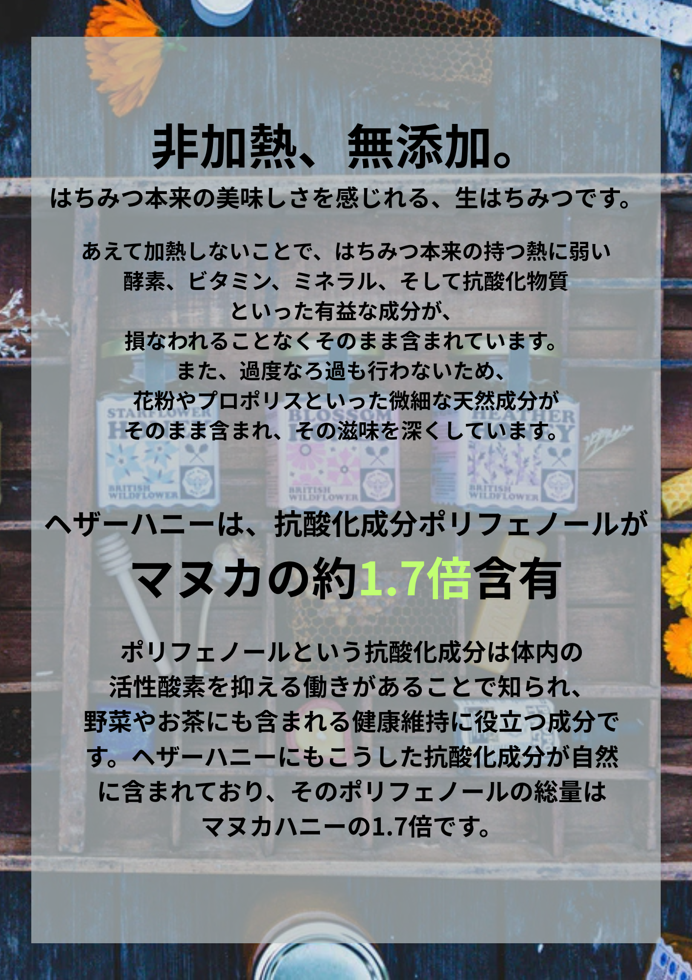 さらにヘザーはちみつの抗酸化作用はマヌカに匹敵すると言われています。ポリフェノールも豊富で健康に非常に良いイギリス産ヘザーはちみつです。