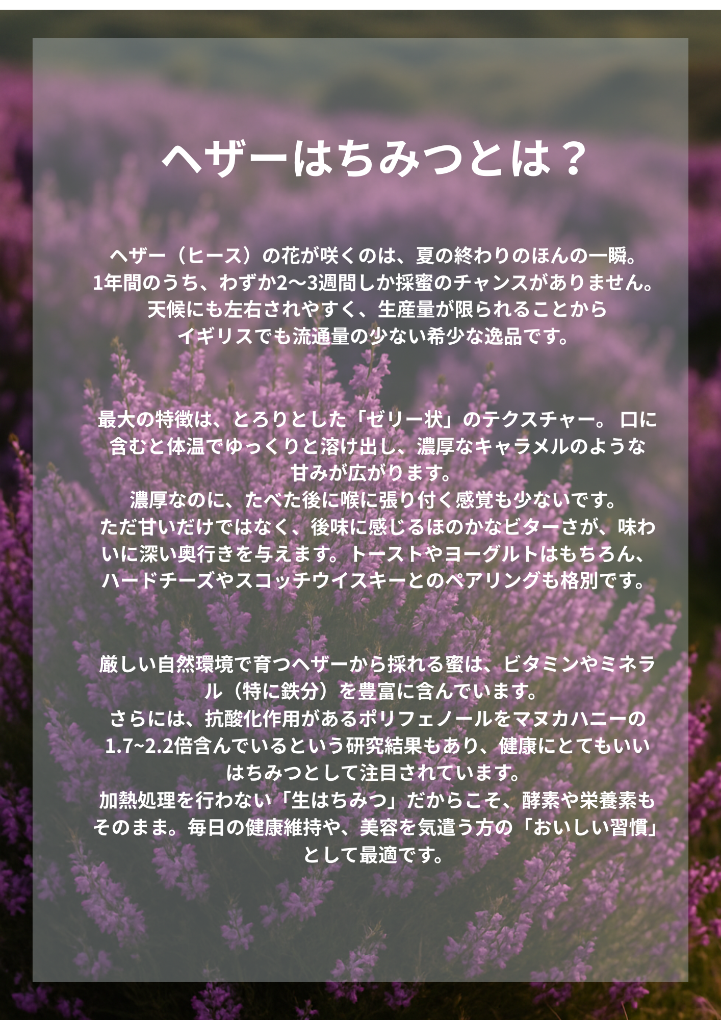 イギリスの地に、夏の2〜3週間のみだけ咲くヘザーの花蜜のみを使用した、ここだけの特別な非加熱の生はちみつです。